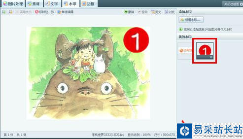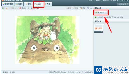 4、首先下載該圖片(點擊下載),然后點擊上方的【水印】欄,選擇【新增水印】,然后導入剛才下載的圖片。(如下圖)