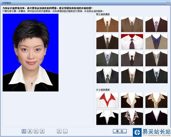 5.替換服裝。點擊“細節調整”,選擇“證照服裝替換”,在對話框中選擇一款服裝,在脖子處畫一條線,自動替換服裝,然后仔細調整好位置。