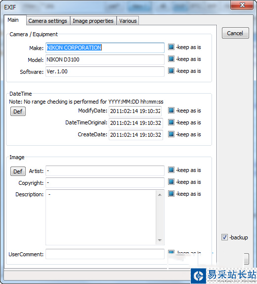 進入編輯視窗後,就依照想要修改的欄位直接填寫吧,第一個MAIN是主要資訊,像是相機的品牌、機型、軟體版本、還有拍照時間等等。