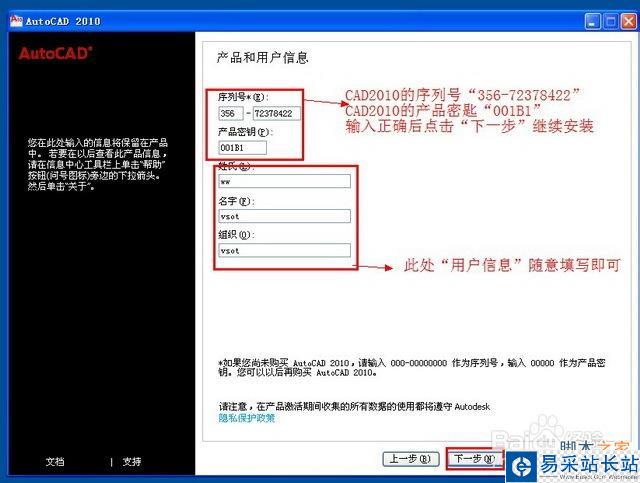 用戶信息自己隨意填寫即可 CAD2010 32位中文版序列號“356-72378422” CAD2010 32位中文版產品密匙“001B1” 輸入無誤后點擊“下一步” 如圖六。