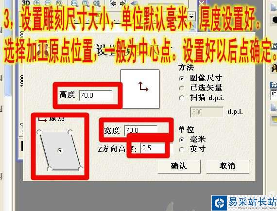 3、設(shè)置雕刻尺寸大小,單位默認(rèn)毫米,厚度設(shè)置好。選擇加工原點(diǎn)設(shè)置,一般設(shè)為中心點(diǎn)。設(shè)置好以后點(diǎn)確定。