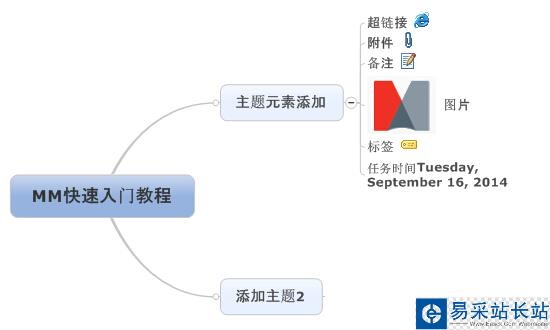 第三步 添加主題信息。通過菜單插入->主題元素工具,可以為主題添加超鏈接、附件、備注、圖片、標簽、提醒以及指定任務信息等信息。
