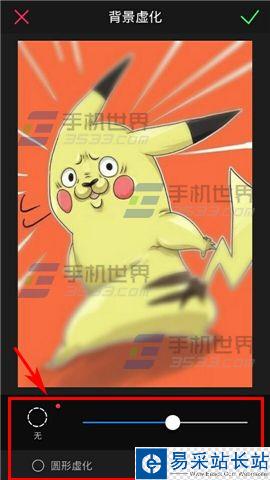 2)下面的編輯欄拉到最后面找到【背景虛化】,然后我們就可以對圖片進行背景虛化處理,可以選擇選擇【圓形虛化】或【直線虛化】,也可以調整虛化的范圍,調整完成后點擊右上角【√】即可保存。(如下圖)