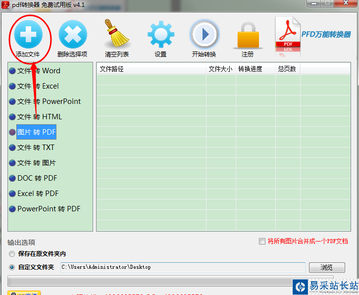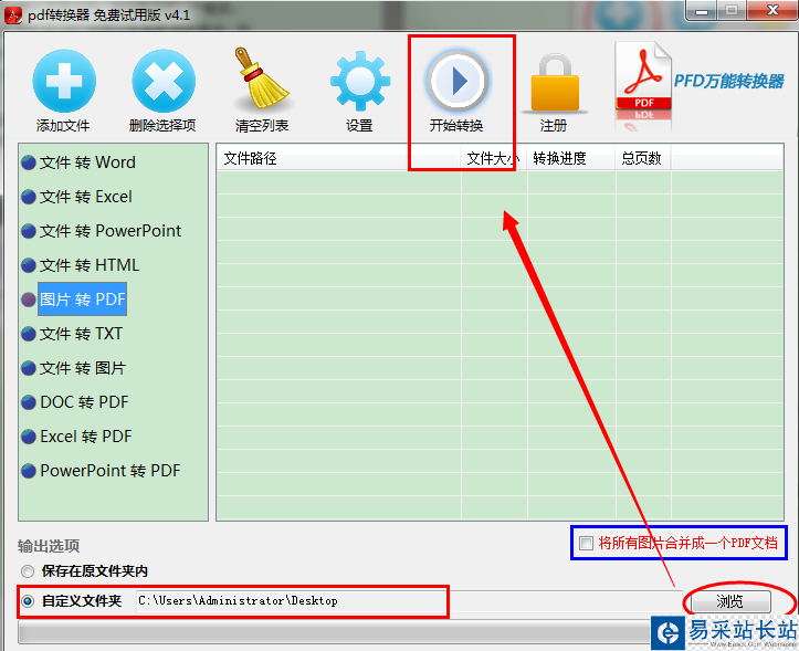 其次就是選擇文件的輸出路徑,即轉(zhuǎn)換后的文件保存的位置,點擊“瀏覽”自定義文件保存路徑。當(dāng)添加多個圖片時可以勾選將所有圖片合并成一個PDF文檔。