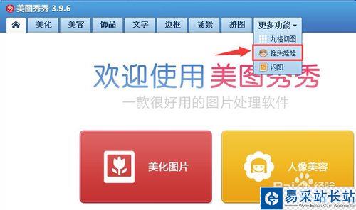 1、首先在電腦中打開美圖秀秀客戶端,來到美圖秀秀首頁,再點擊更多功能中的“搖頭娃娃”功能。(如下圖)