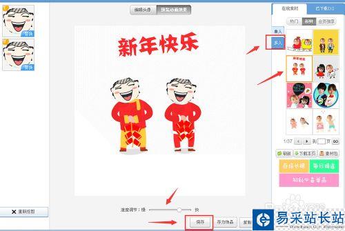 6、然后來到預覽動畫效果設置窗口,在右側的在線素材中選擇自己喜歡的圖案,也可以選擇多人搖頭設置,然后在下面設置搖動的快慢,完成設置之后,再點擊下面的“保存”按鈕。(如下圖)