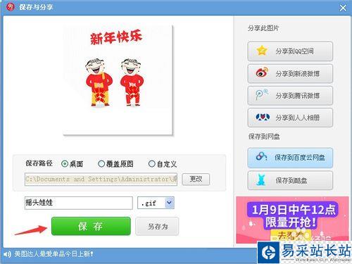 7、來到搖頭娃娃圖片的保存與分享設置窗口,選擇保存圖片的路徑之后,再編好圖片的名稱,再點擊保存按鈕,這樣就可以把剛才制作的搖頭娃娃保存下來了。(如下圖一、圖二)