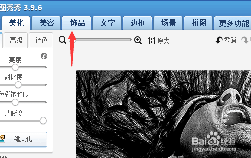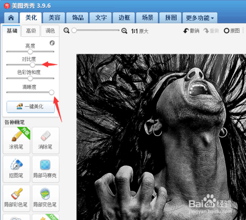 然后在左側色彩調節欄中將清晰度調到最大,并且調高一點點對比度。(圖片上面有水印的話可以用他左側的消除筆功能擦掉水印)