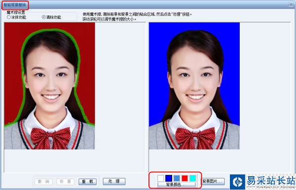 很多證件照片一般都是一寸照片,并且需要藍色背景,喜慶的就是紅色背景,那么我們平時的生活照就需要換背景才能變為證件照片,這是你就可以用“證照之星”,點擊工具欄‘背景處理’,在背景替換框下面顏色區,點選藍色就可以了,系統是自動摳圖的。