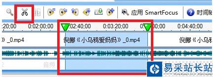 5、由于這里的視頻是含有音頻的,導入的視頻不包含音頻,可以自己添加音頻文件,音頻文件同樣使用拖拽的方法,但是要拖拽到視頻下方的音頻軌道上。如果覺得視頻哪里不需要,需要剪掉,可以先在軌道上選擇區間,隨后點擊工具欄上的小剪刀即可