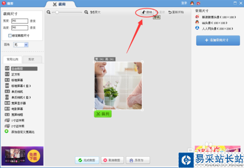 6、如果覺得裁剪的大小并不滿意,可以點擊上方的“撤銷”,就會取消剛才最近一步的操作。有些圖片處理就是需要反復調試才行。