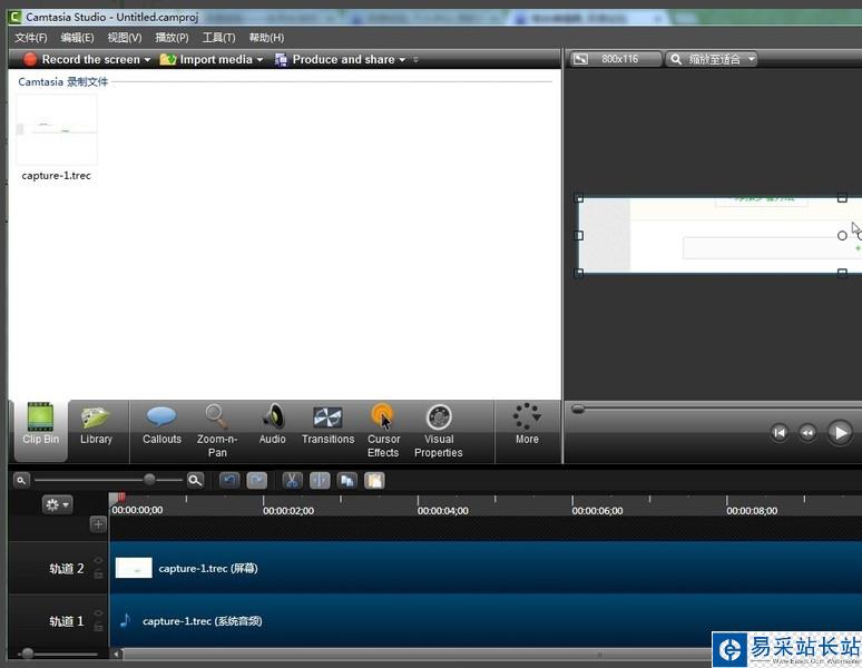 4、選擇save and edit,保存之后,它會自動在camtasia studio8中將其打開,我們就可以進(jìn)行各種編輯了。有兩個(gè)文件視頻和音頻,這是錄制中產(chǎn)生的,也錄了聲音。