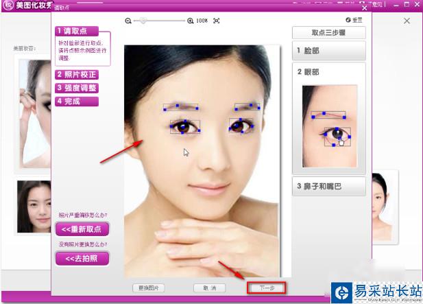 3、在彈出的窗口中在調(diào)整眼部,完成以后單擊下一步
