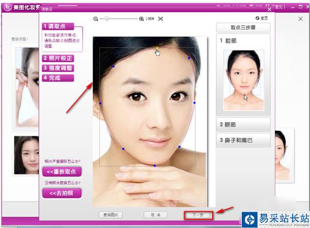 2、在彈出的窗口中需要三步,調(diào)整臉部,眼部,鼻子和嘴巴,調(diào)整一下。調(diào)整好臉部以后單擊下一步