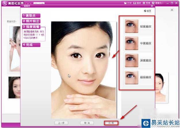 6、在彈出的窗口中美化一下臉部皮膚,此步可以直接單擊完成按扭單,擊完成后,就可以化妝照片了