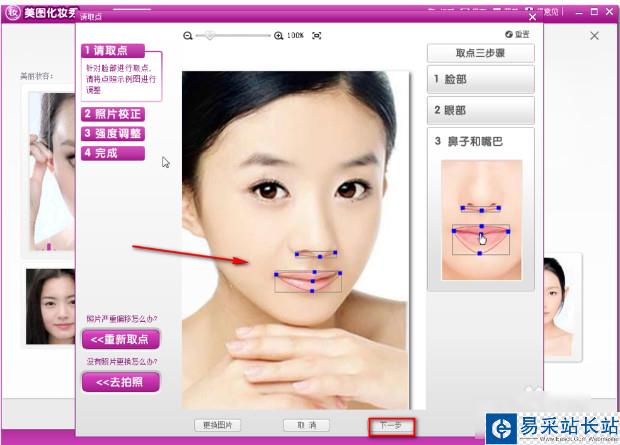 4、在彈出的窗口中在調(diào)整一下鼻子和嘴巴,調(diào)整完成以后單擊下一步