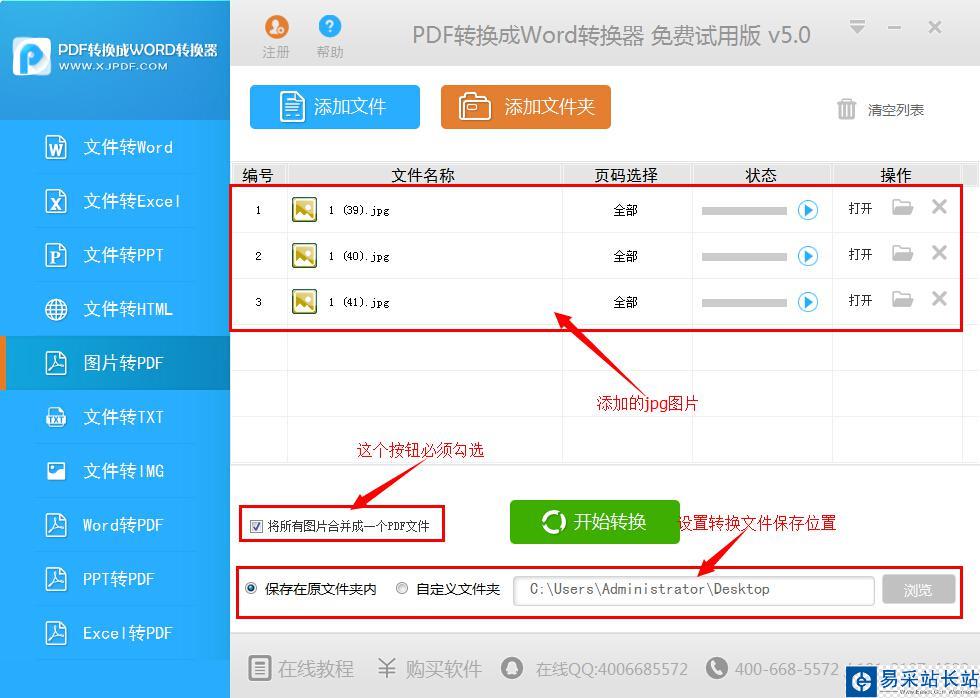 第3步:jpg文件添加完成,設置轉換文件的保存位置,并勾選“將所有圖片合并成一個PDF文件”按鈕。