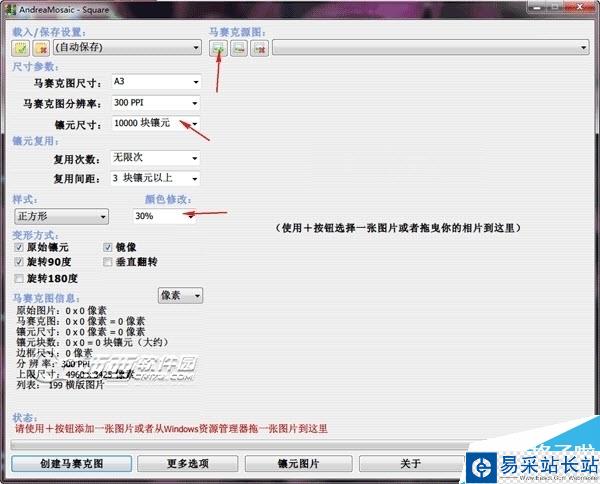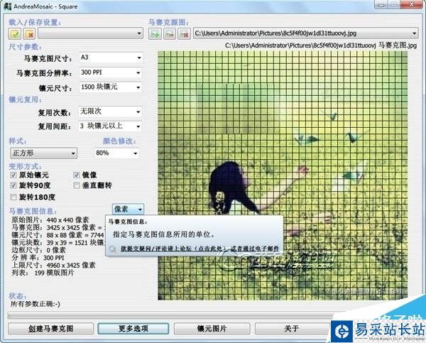 添加一張要被拼接成的母圖,并且選擇鑲元尺寸,鑲元尺寸越大拼接的小圖越多,拼接出來的圖片也就越精細。不過不建議太大,那樣就看不出蒙太奇的效果了。顏色修改一般選擇50%就可以~然后點擊下面的“鑲元圖片”按鈕。