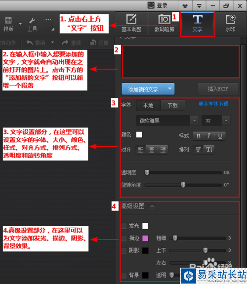打開一張圖片后,點(diǎn)擊右上方“文字”按鈕,就會(huì)出現(xiàn)添加文字相關(guān)的設(shè)置項(xiàng),具體說(shuō)明請(qǐng)看下圖: