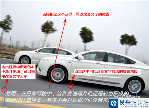 輸入文字之后,文字就會(huì)自動(dòng)出現(xiàn)在之前打開的圖片上。通過(guò)拖動(dòng)文字外部的籃框,可以直觀的改變文字字體大小、旋轉(zhuǎn)角度、出現(xiàn)位置