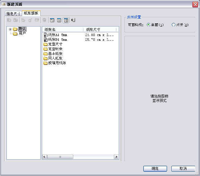 小貼士: 作品建成后,可以自由刪除或增加頁面,也就是說,頁數可以自己再修改,也可以設置某2個頁面變成跨頁; 而單頁作品,則不可以添增新頁面,也沒有辦法變成跨頁。 “建立頁面”有一個“紙張模板”(見圖)