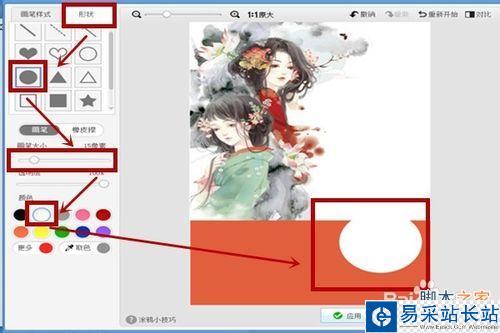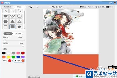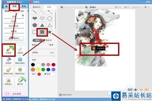 調整之后選擇"美化”,點擊“涂鴉筆”進入之后在選擇“形狀”,為了能畫出好看的圖形,我們這里要選擇的是正方形實體的,如下圖所示,接著選用“取色筆”取圖上的顏色。