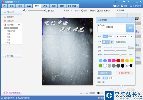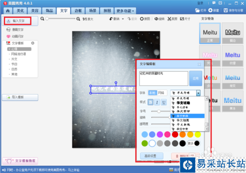 在文字編輯框里,輸入你想寫的話。然后設置字體,大小,樣式,透明度,顏色等等……