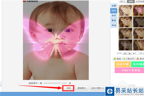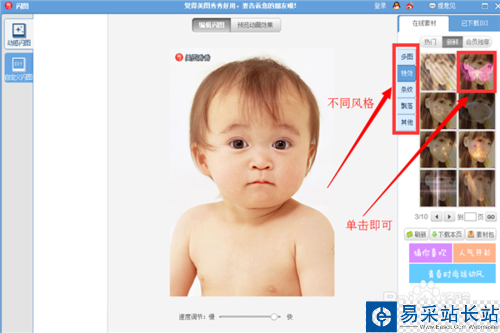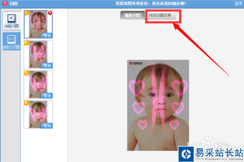 5、則會(huì)默認(rèn)進(jìn)入動(dòng)態(tài)閃圖的制作頁(yè)面,右邊有不同風(fēng)格的閃圖可供選擇,單擊閃圖即可應(yīng)用到當(dāng)前的圖片上。