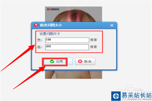 8、單擊“修改閃圖大小”之后,你就可以在如下框中自由輸入寬高的像素值,然后單擊“應(yīng)用”即可。
