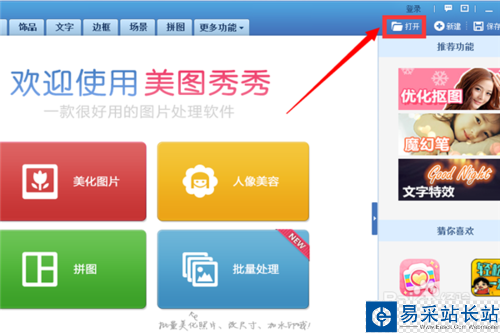 1、打開(kāi)美圖秀秀,然后單擊“打開(kāi)”添加一張圖片。