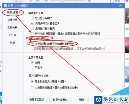 3、在【設(shè)置】界面下,點(diǎn)擊選擇【常規(guī)設(shè)置】--【智能旋轉(zhuǎn)數(shù)碼照片】--勾選【按照拍攝時的橫豎方向播放數(shù)碼照片】--【應(yīng)用】選項(xiàng)完成設(shè)置。(如圖所示)