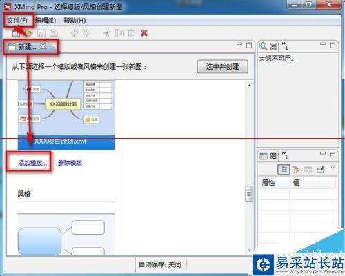7、如果自己收到了其他人制作的思維導圖模板或從網絡上下載了優秀模板,可以選擇【文件】-【新建】-【添加模板】來增加到自己電腦上的Xmind程序中,以后就可以利用上面的方法直接調用。