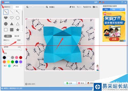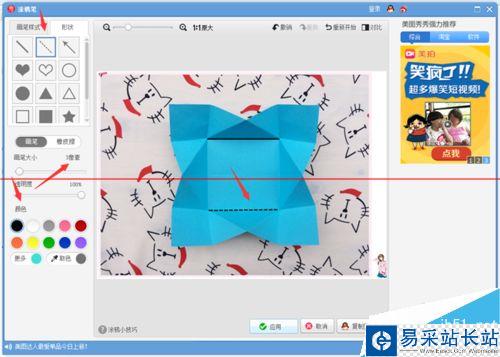 3、畫虛線也是和畫實線的方法是一樣的。選擇“形狀”,然后點擊形狀下面的“虛線”標志,調節畫筆大小、透明度和顏色,直直的畫一道就好了,然后保存。這里要提醒大家的是,如果是在一張圖片上或者是整套折紙圖片中,最好用一樣的畫筆大小來完成,這樣做會讓圖片變得很美觀。