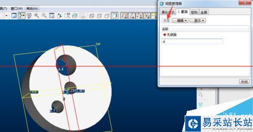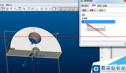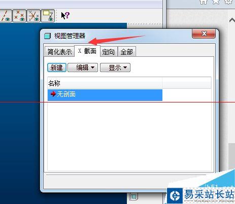 3、打開視圖管理器,出現一個對話框,找到X截面并點開,如圖中箭頭所示。然后點擊新建,并對剖視圖進行命名,本例輸入a,