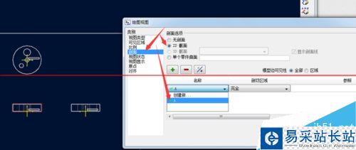 7、雙擊如圖中圓圈中的視圖,出現圖中的對話框,在對話框中依次找到剖面,然后選中2D截面,再如圖中箭頭所示,找到新創建的A截面,綠色對勾表示該截面對該視圖可用,如果為紅色X,表示該截面對該視圖不起作用,需要重新換個視圖