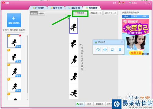 點(diǎn)擊”切換“鍵可以在豎板與橫板之間切換,可以拖動(dòng)圖片更換照片順序。