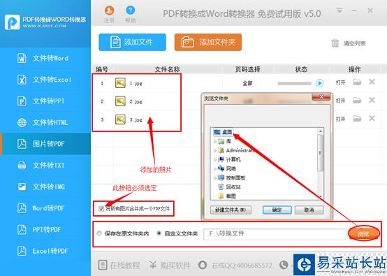 四、照片添加完成后,設置轉換文件的存儲位置。我們看到迅捷PDF轉換器中可供選項比較多,如“保存在原文件夾內”、“自定義文件夾”,也可以點擊“瀏覽”按鍵選擇更多的路徑來存放轉換好的pdf文件,設置方法很多,大家可以自行選擇便可。另外大家還必須選定“將所有圖片合并成一個PDF文件”按鈕,這樣所有照片才會轉換成一個pdf文件。