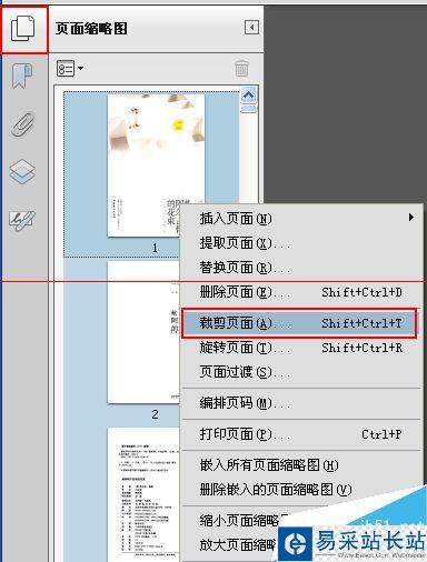 1、點(diǎn)擊左側(cè)的頁(yè)面縮略圖按鈕,點(diǎn)擊任意一個(gè)縮略圖,然后按鍵盤(pán)上的Ctrl+A全選所有頁(yè)面,右擊,選擇 裁剪頁(yè)面: