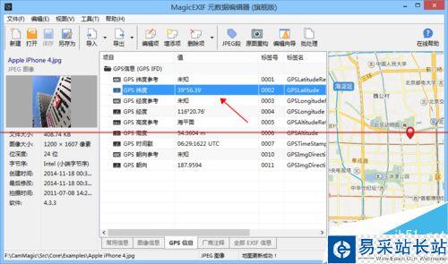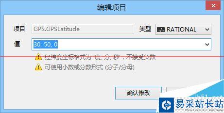 1、繼續以上面的照片做例子,首先編輯照片的緯度數據,雙擊列表中的“GPS 緯度”進入編輯模式。