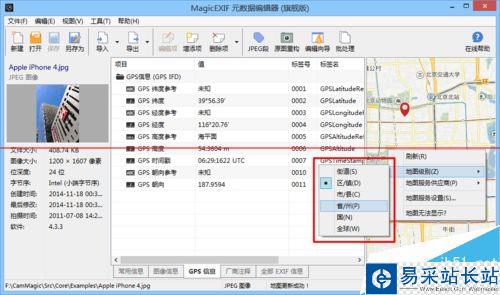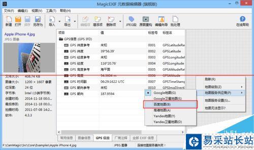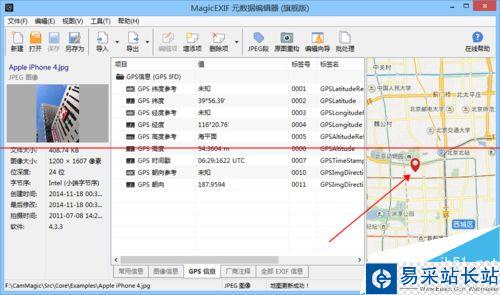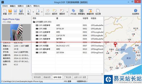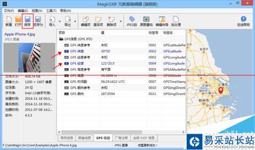 3、同理雙擊“GPS 經度”可以修改照片的GPS經度數據,完成編輯后可以看到被編輯的項目變成藍色,而且右側的地圖也被更新了。點擊工具欄的“保存”按鈕保存對照片的編輯。