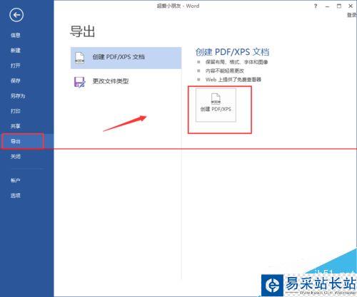 2、【文件】菜單里,有一項名為【導出】,點擊【導出】,右側可以看到【創建PDF/XPS文檔】,點擊該按鈕