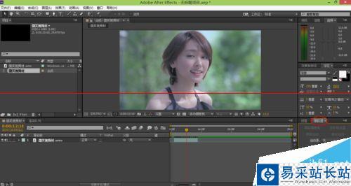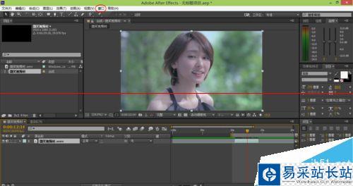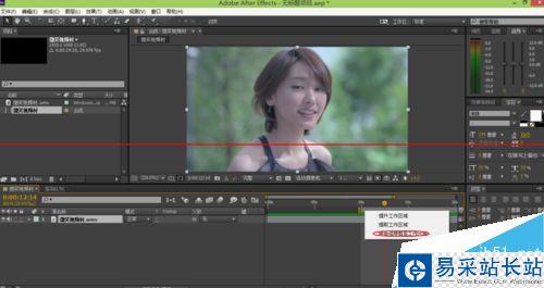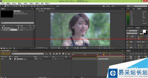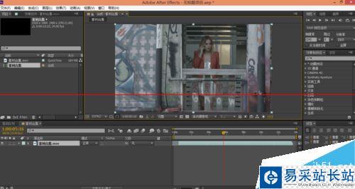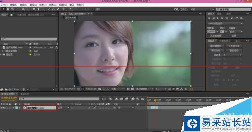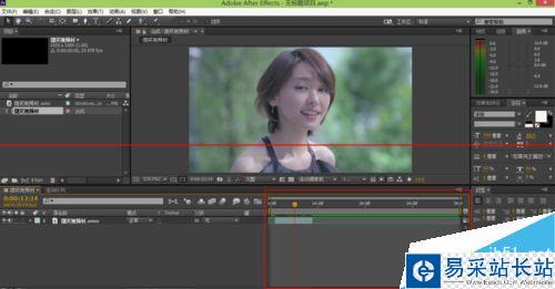 4、我們選取視頻中的一部分做演示,為了工作方便,我們把工作區(qū)調(diào)節(jié)到和剪輯后的視頻時(shí)間長(zhǎng)度。操作步驟:在圖中紅色矩形方塊中右鍵(如果不行,就先拖動(dòng)以下工作區(qū)兩側(cè)黃色的東西,任意一個(gè)就行)---將合成修剪至工作區(qū)域。