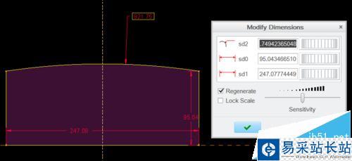 2、單擊“草繪”按鈕,進入草繪繪圖環境,繪制如圖中所示帶大圓弧的封閉草繪截面;修改截面尺寸為需要值