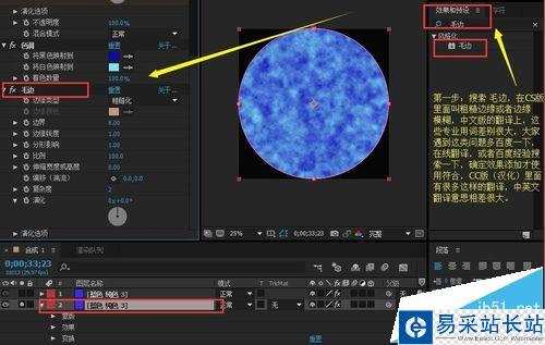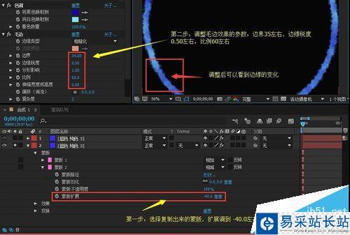 還是選擇下面的固態層,毛邊效果里面找到演化第一幀打上關鍵幀,0x不要調,這是我打好后截圖寫的說明。