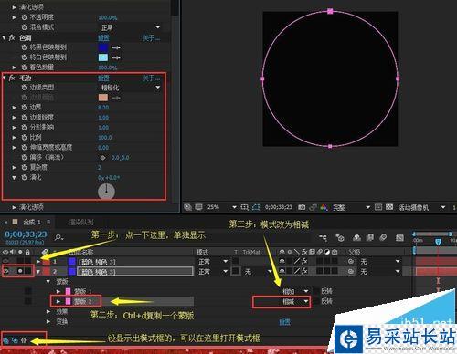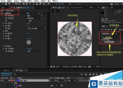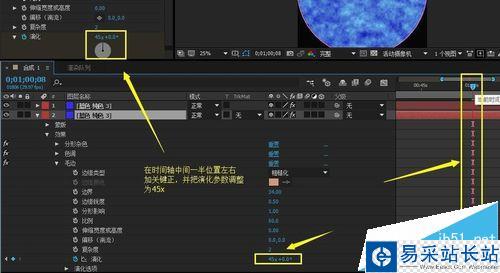 找到分形雜色下的演化,在固態層第一幀打上關鍵幀(第一幀為0x,數字不變,圖上是我調好了截圖寫的經驗步湊說明)然后在時間軸一半左右添加關鍵幀,并將演化的0x 調整為45x,這時你可以拖動時間軸觀察變化