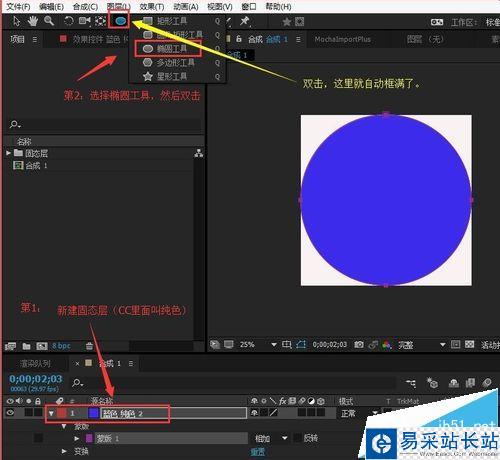 選擇橢圓工具,然后直接在橢圓工具按鈕上雙擊,圓圈蒙版(遮罩)自動填滿固態層四方形,