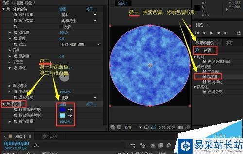 搜索效果里面:色調,添加到固態層,把第一項將黑色映射到:調為深藍,第二項將白色映射到:調為淺藍