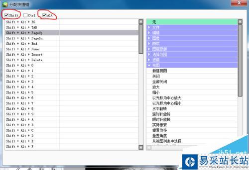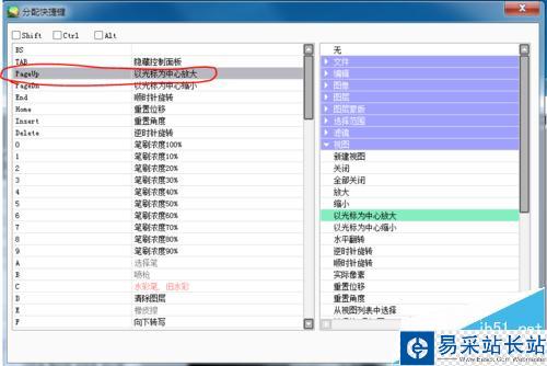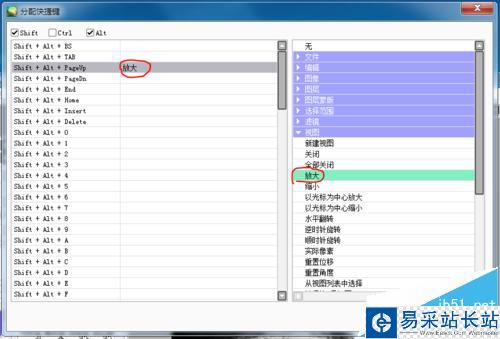 5、最后要做的就是在右側的功能菜單中找到"放大",左邊點一下就可以把這個功能關聯為Shift+Alt+PageUp快捷鍵了。設置完畢點擊確定就可以保存。