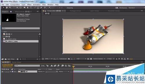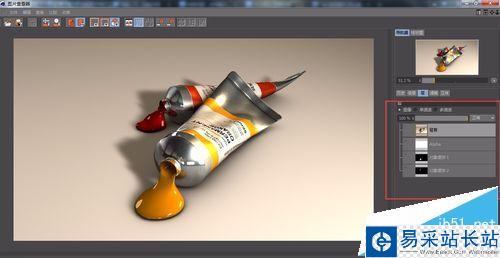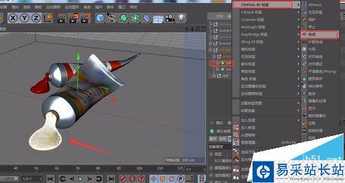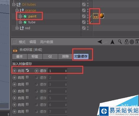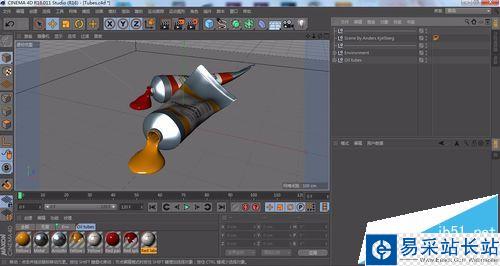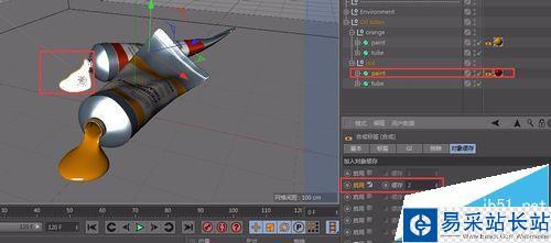 2、然后,在這里我是想把顏料管外面流出的顏料提取出來,以便在后期軟件中更快捷的更換顏色(你可以根據自己的場景的需要來進行提取自己需要的元素)。在場景中點選要提取的元素,在右側的對象欄中找到相對應的模型,然后右擊添加合成標簽。