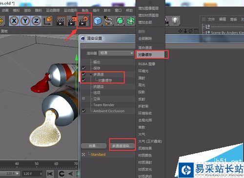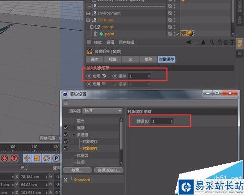 4、然后,打開渲染設置,在多通道渲染中添加對象緩存,并設置群組ID(這里設置的ID號要與上一步設置的ID號一致,這樣才能正確的渲染)。